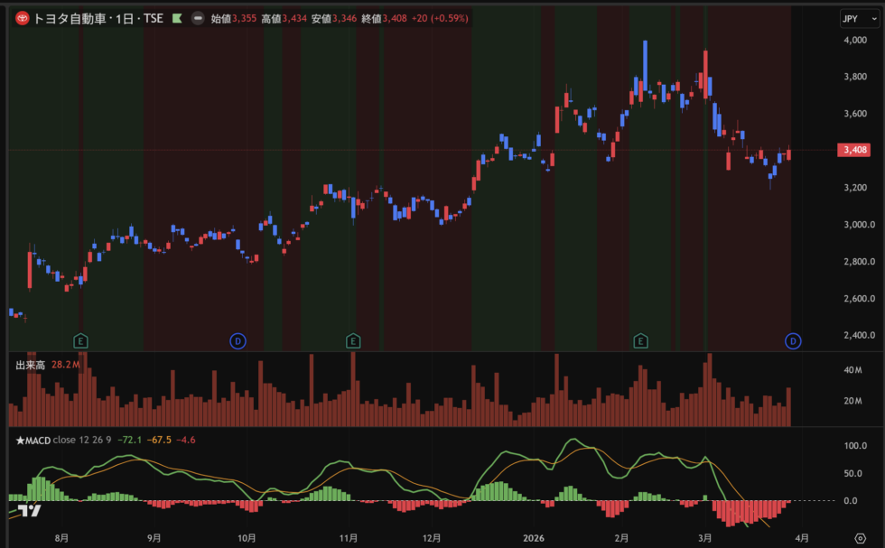 TradingViewの標準MACDインジケーターはサブチャートに表示されるため、メインチャートだけ見ているとMACDの方向がわかりません。