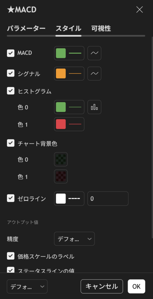 グラフ表示ゼロライン(白破線)MACDの基準線(0)
